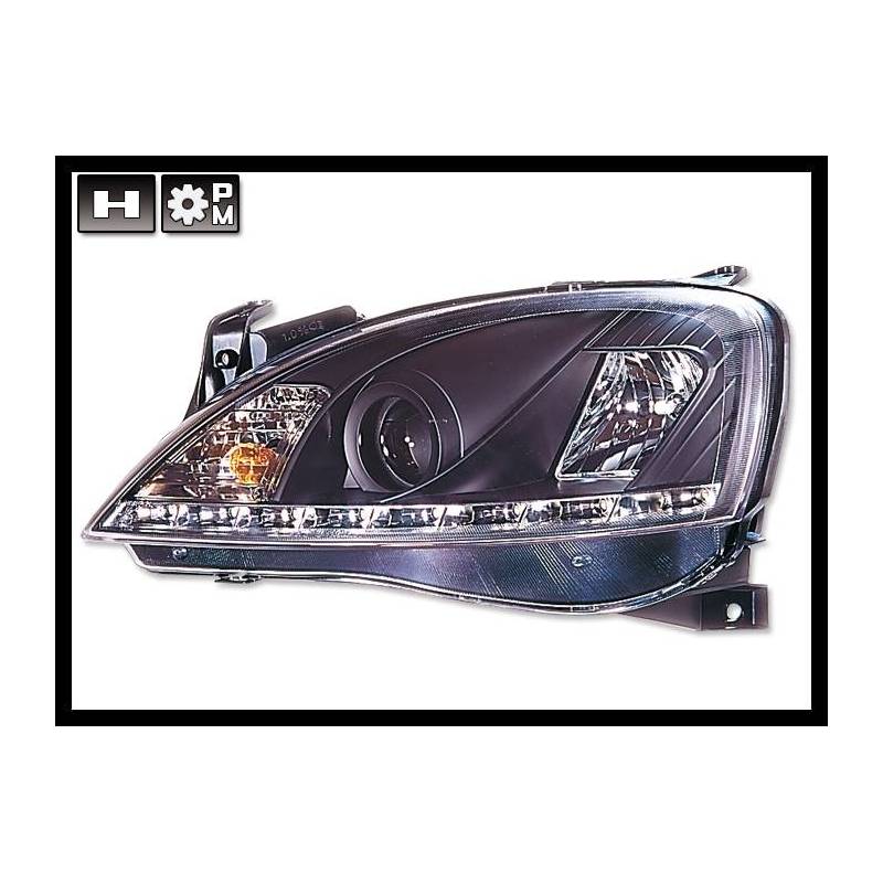 Conjunto de faros delanteros con luz de día Real para el Opel Corsa C con el fondo en negro.